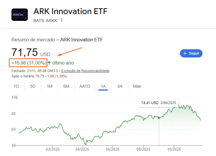 In eToro, an online broker with over 35 million users, you can buy a CFD of ARKK. As previously stated, in practice, owning the ARKK ETF or a non-levered CFD of ARKK ETF should give you a very similar performance, as shown here (performance from 21/11/2024 to 21/11/2025):