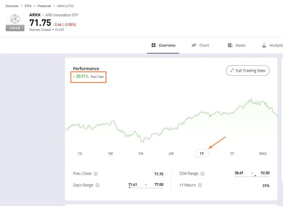 As you can notice, the “real” ARK Innovation ETF had a one-year performance of +31%. On the other hand, the CFD on ARK Innovation ETF had a one-year performance of +30.91% for the same period.