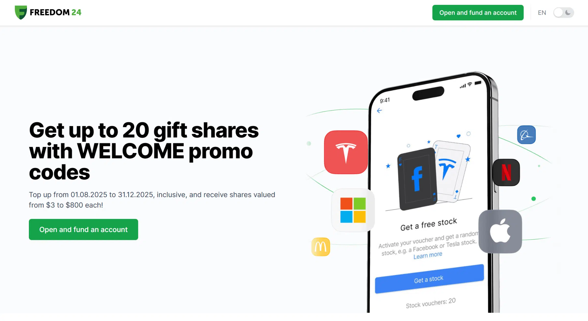 Freedom24 promo code: use WELCOME1, WELCOME5, WELCOME20 or WELCOME50 when you open your account and get up to 20 gift shares worth up to $800 each 🎁 (available in the EU, Switzerland, Qatar, Thailand, and the UAE).