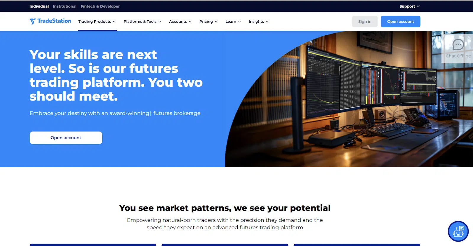 TradeStation is a well-established US brokerage known for combining professional-grade trading technology with competitive pricing. Its futures offering provides direct access to CME Group exchanges (CME, CBOT, NYMEX and COMEX) and focuses on real, exchange-traded futures contracts.