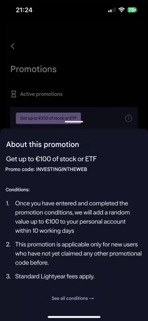 Lightyear promo code: paste INVESTINGINTHEWEB when you sign up and get a free fractional share worth up to €100 (minimum deposit of €100, valid IE, UK, EU).