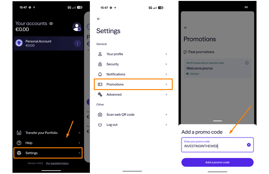 5. Once you have funded your account, you can enter the following promo code in the ‘Promotions’ section of the app: INVESTINGINTHEWEB.