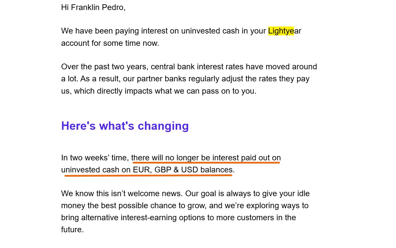 As of October 1st, 2025, Lightyear stopped paying interest on uninvested cash: