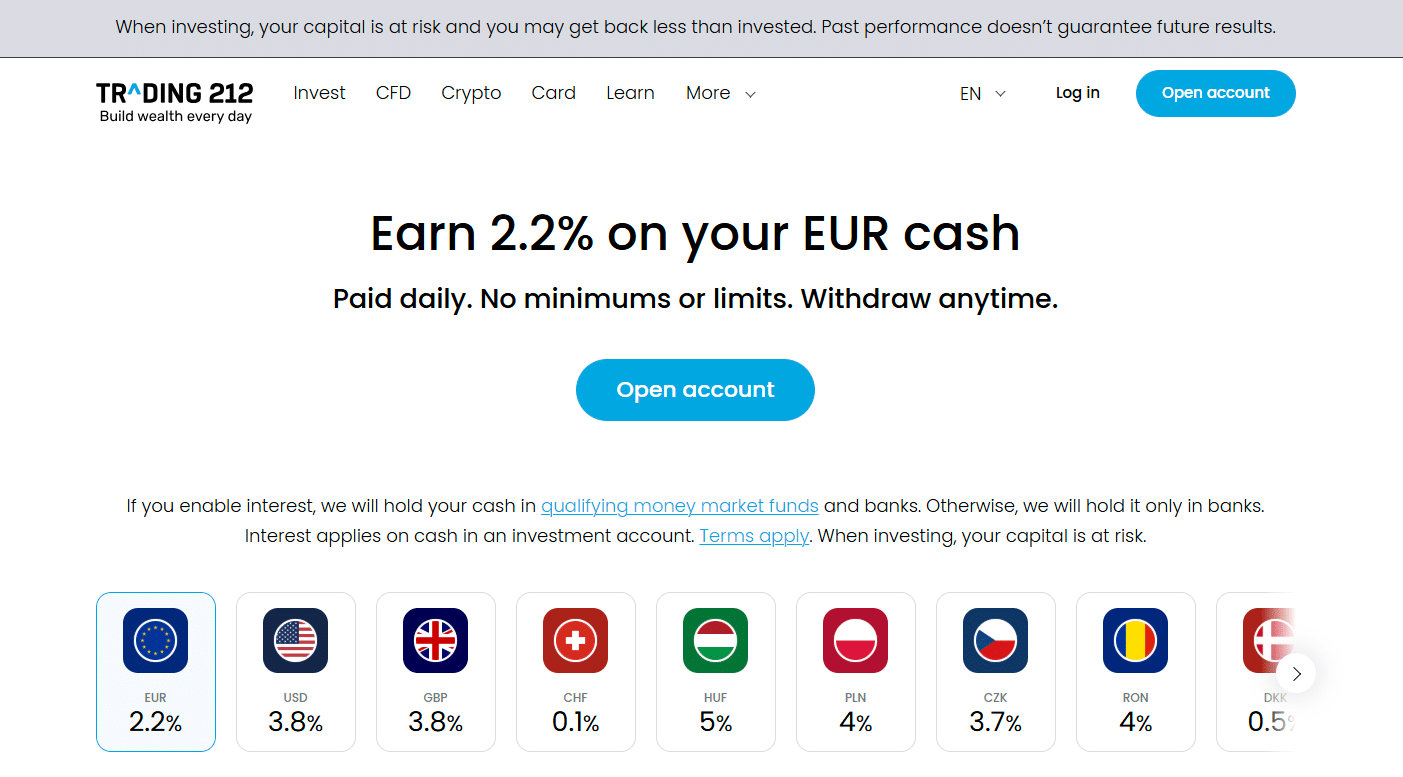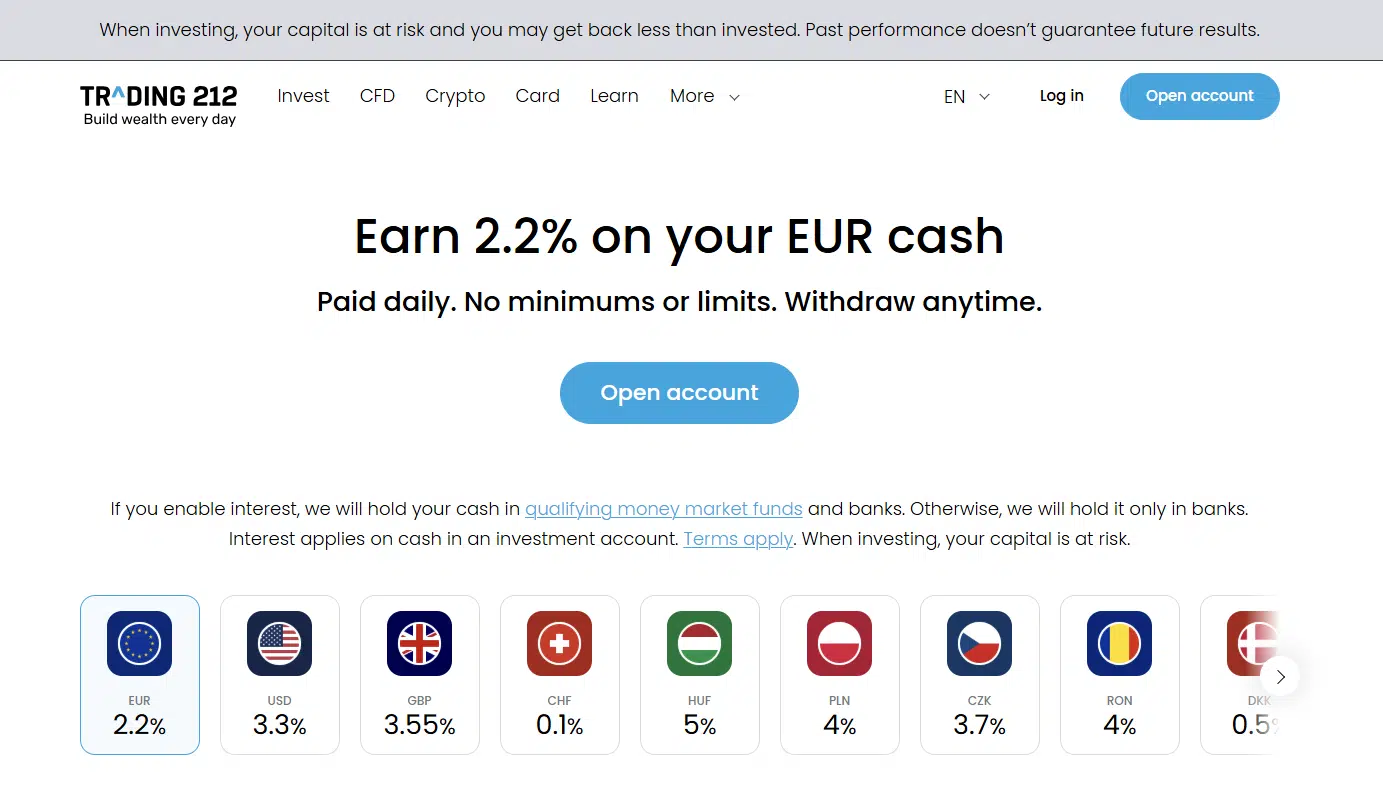 - No minimum or maximum amounts: Whether you have €100 or €1,000,000, you will receive interest on your total cash balance;