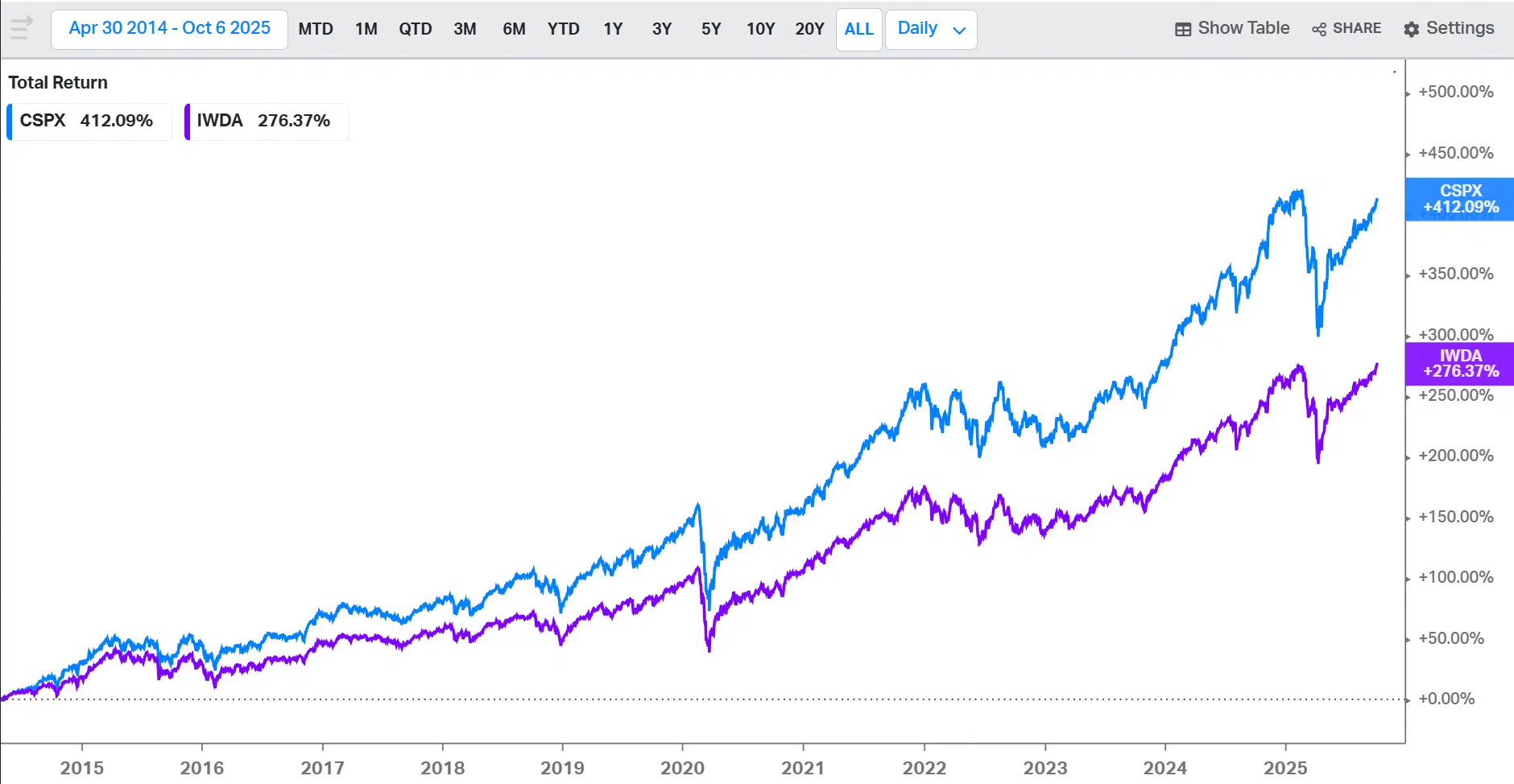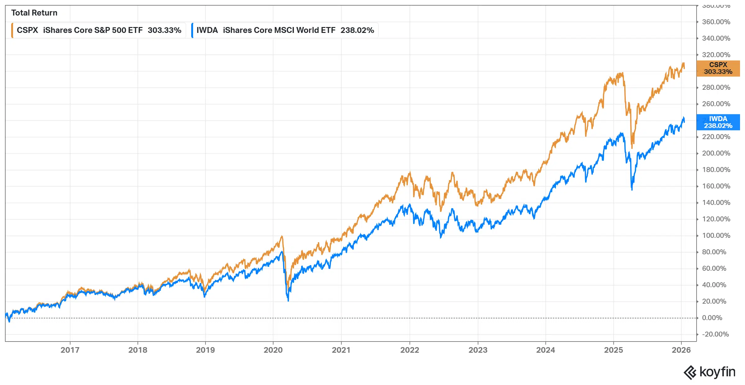 The chosen ETFs to measure the performance of each index are the iShares Core S&P 500 UCITS ETF (CSPX) and the iShares Core MSCI World UCITS ETF USD (IWDA).