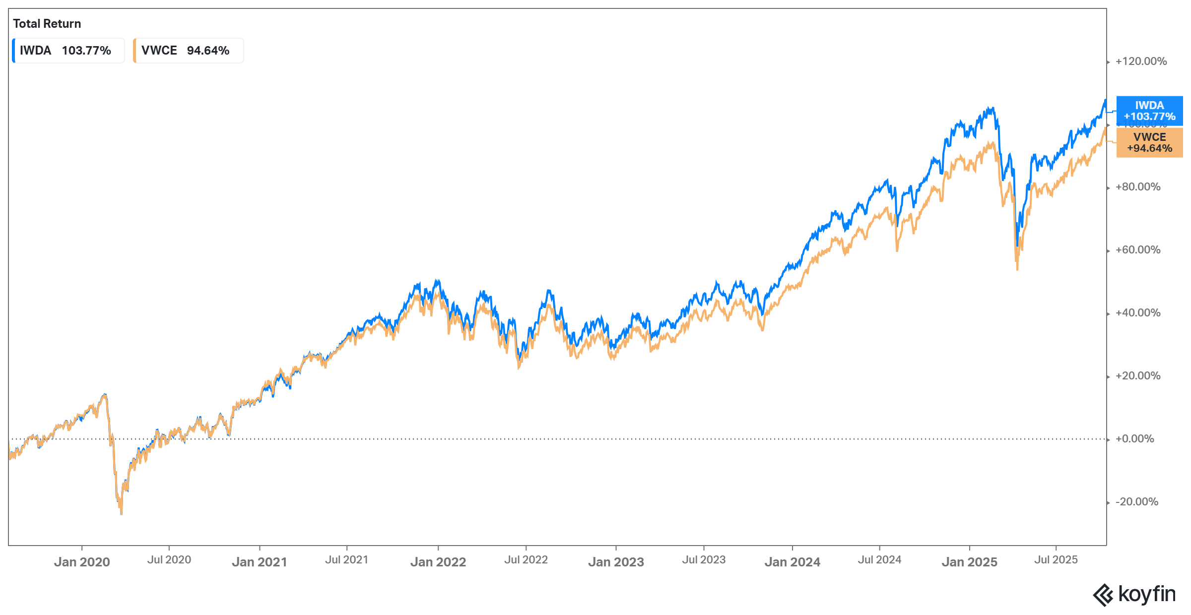 Our team has collected the historical performances of these two ETFs from August 1st, 2019 (near the inception date of the VWRA ETF) until October 13th, 2025, to showcase the performance of each one. When comparing the performance of both ETFs, it is evident that the IWDA (green line) has outperformed VWRA (orange line).