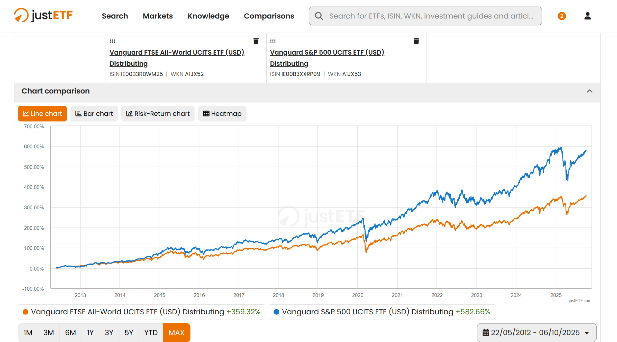 Including dividends, the VUSA performance was +582%, and the VWRL was +360%. The first ETF obtained a much better result than the VWRL, so we consider it a clear winner in this metric.