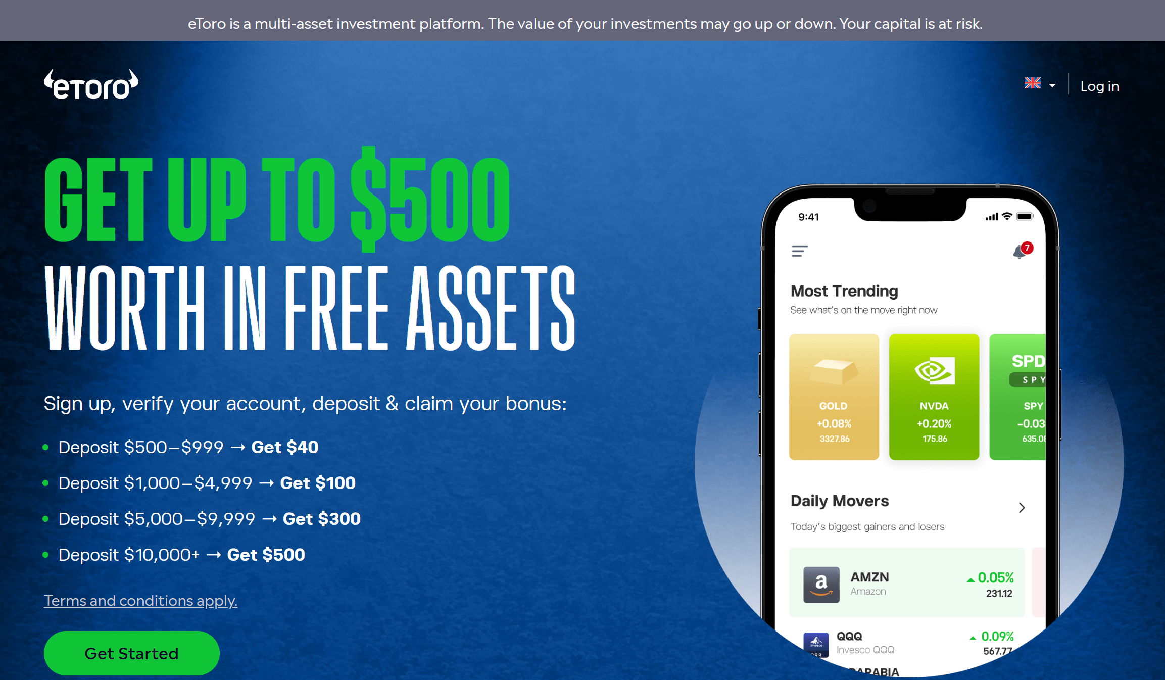 As part of its marketing strategy, eToro promotes its trading app by giving you a free asset (or share) worth between $40 to $500, just by signing up and depositing more than $500:
