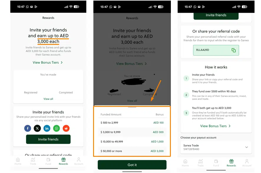 The Sarwa bonus program is designed to incentivise users to open a Sarwa account and get up to AED 3,000 bonus.