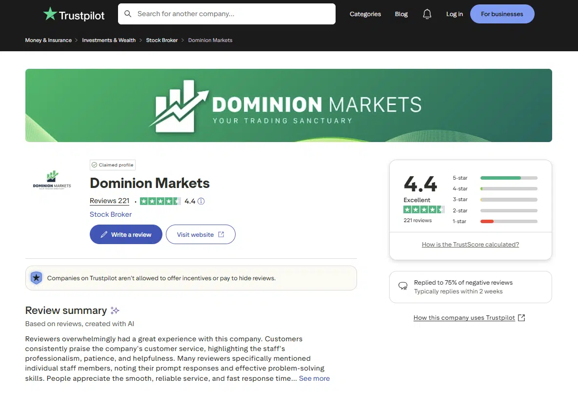 Dominion Markets boasts over 220 reviews on Trustpilot: