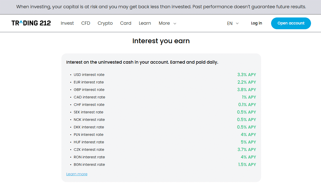 | 💰 Interest on uninvested cash (annually) | EUR: 2.20%; USD: 3.30%; GBP: 3.80% |